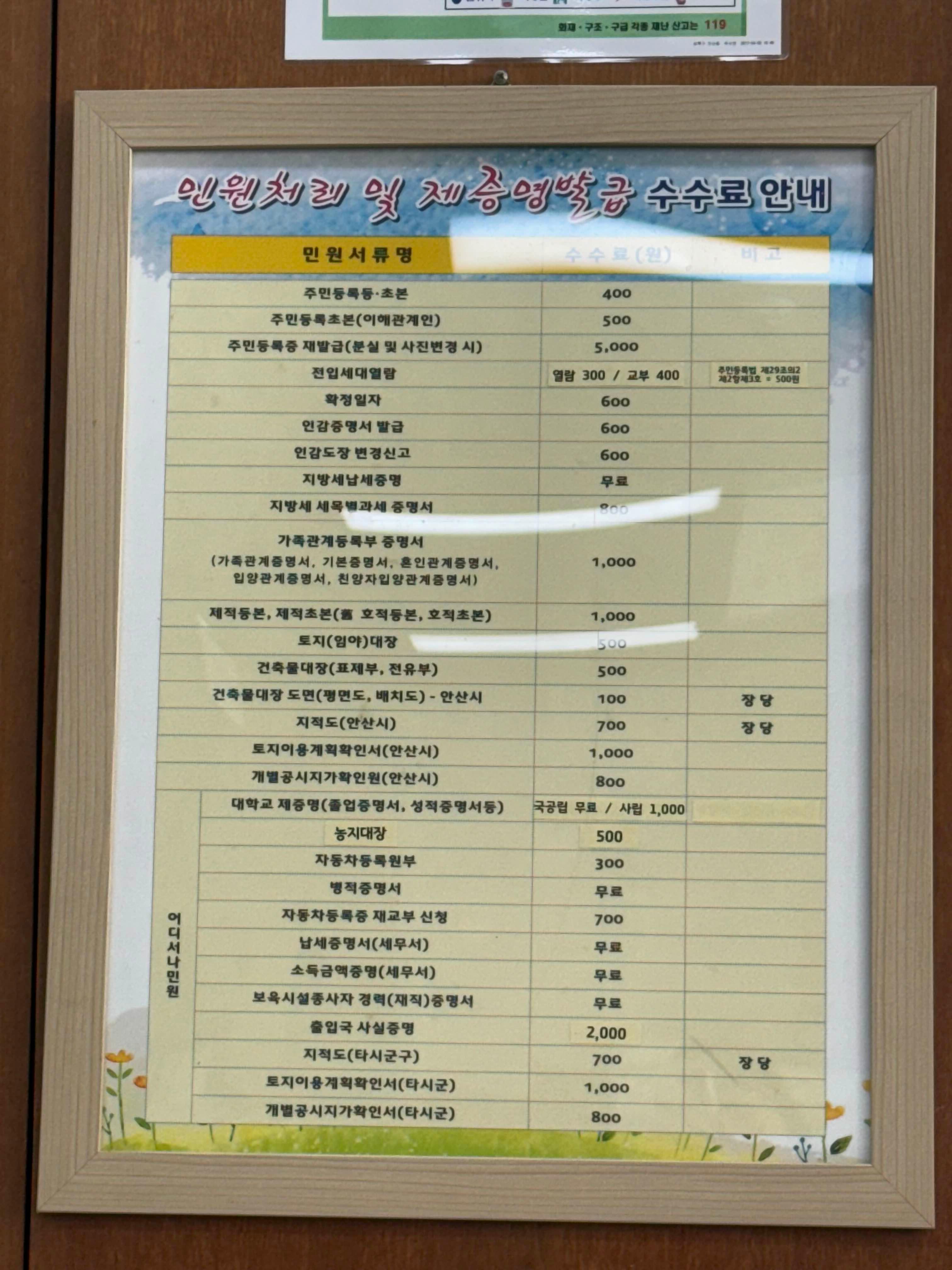 안산동 주민센터의 등본, 가족관계증명서 등 민원서류별 수수료는 위와 같습니다. 주민등록증 재발급 수수료가 5천원으로 제일 높네요.