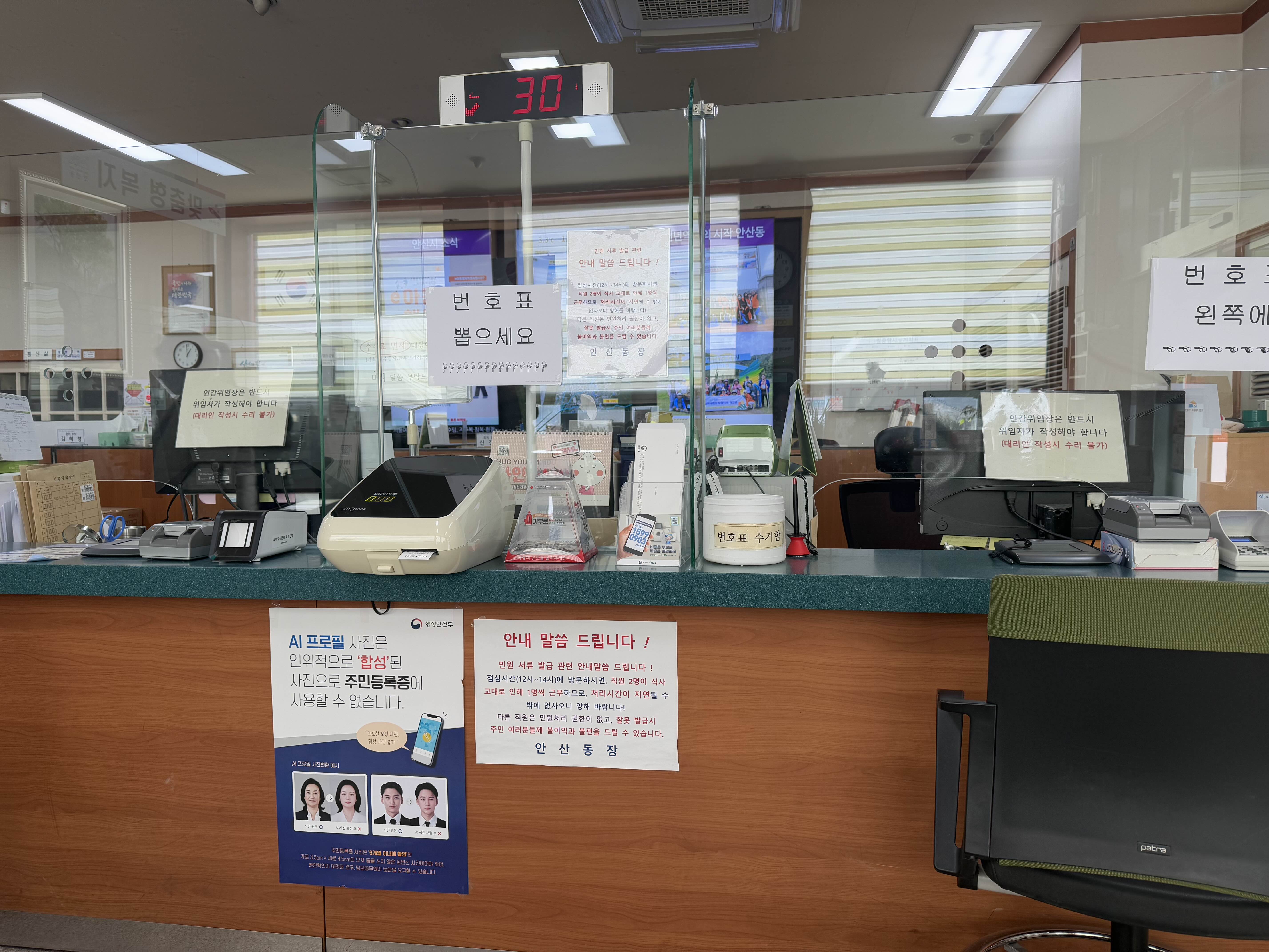 점심시간에도 제일 바쁜 안산동 행정복지센터의 민원서류 발급창구입니다. 저는 공공근로 접수시에 필요서류인 등본과 가족관계증명서를 발급받았습니다. 아주 빠르게 처리해주셔서 완전 만족!