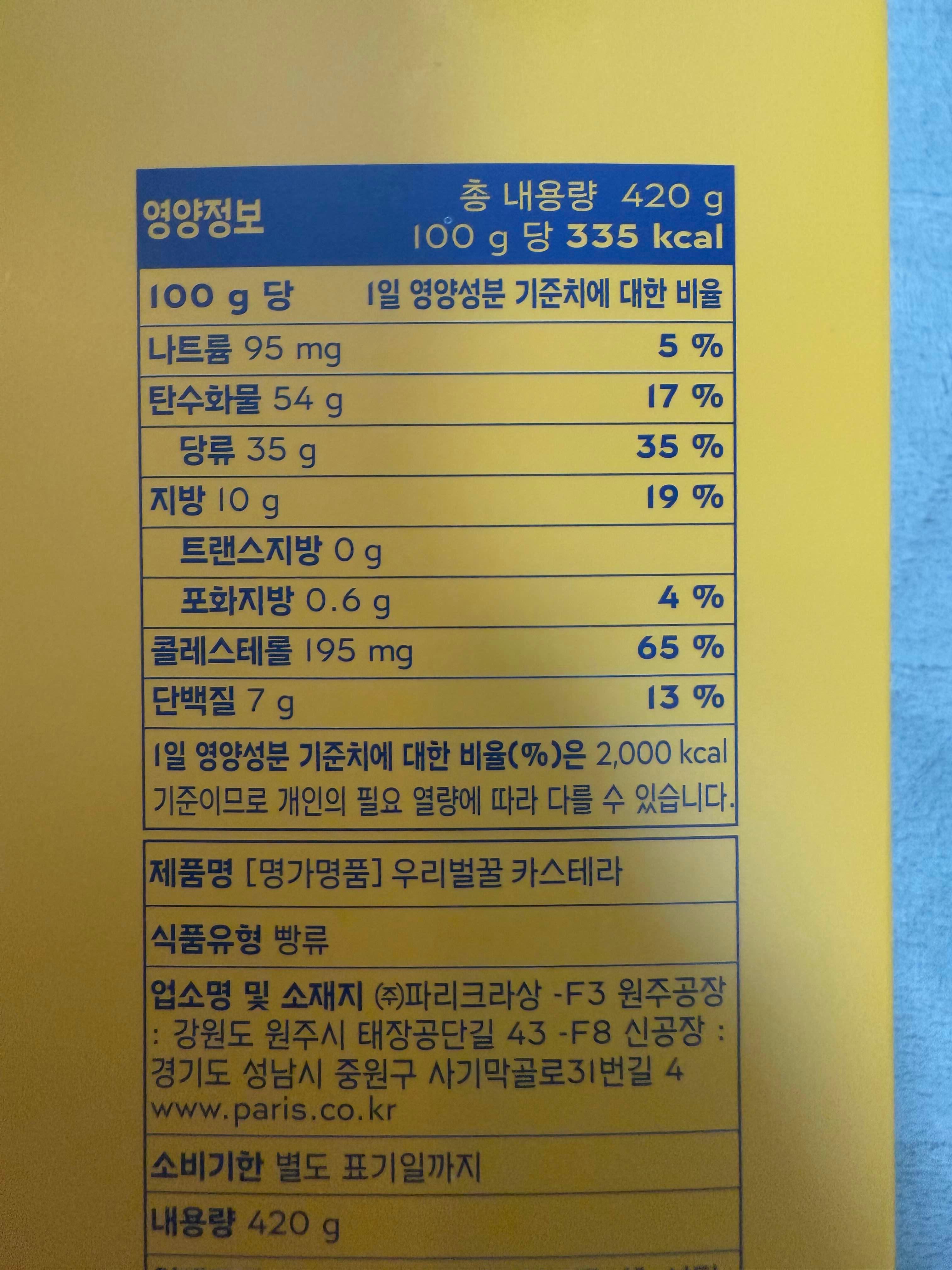 우리벌꿀 카스테라의 100g 당 칼로리는 335kcal에요. 계란이 많이 들어가서 그런지 콜레스테롤 함량이 꽤 높네요. 원재료로는 국산 계란, 설탕, 물엿, 밀가루, 국산 사양벌꿀, 채종유, 천일염, 기타 식품첨가물이 포함되어 있어요. 딱 카스테라 만들 때 기본적으로 들어가는 재료들인 것 같네요. 보관방법은 직사광선을 피하고 실온에 보관하면 된다고 해요.